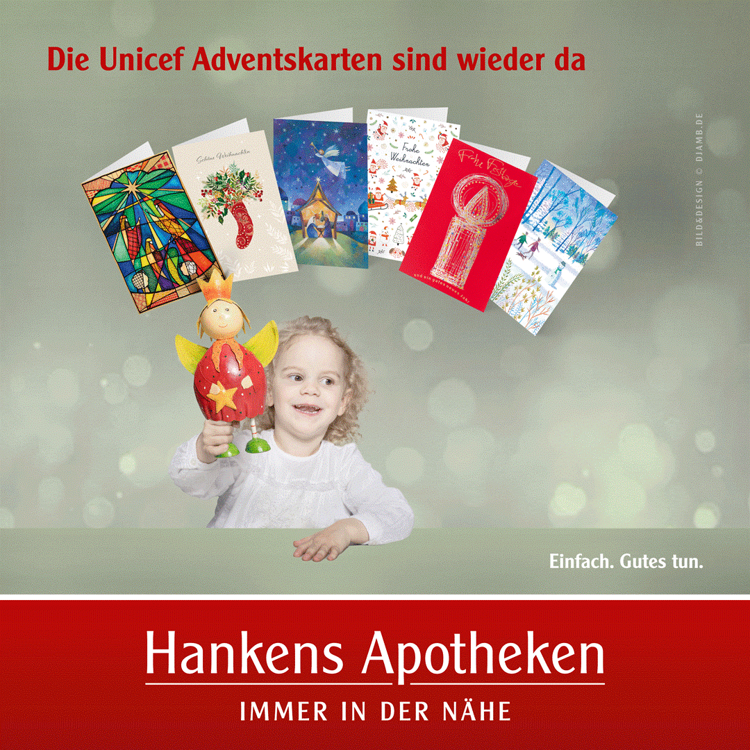 Nicht verpassen: Auch diese Jahr gibt es wieder viele weihnachtliche Motive der beliebten Unicef-Karten – ab sofort in allen Hankens Apotheken.